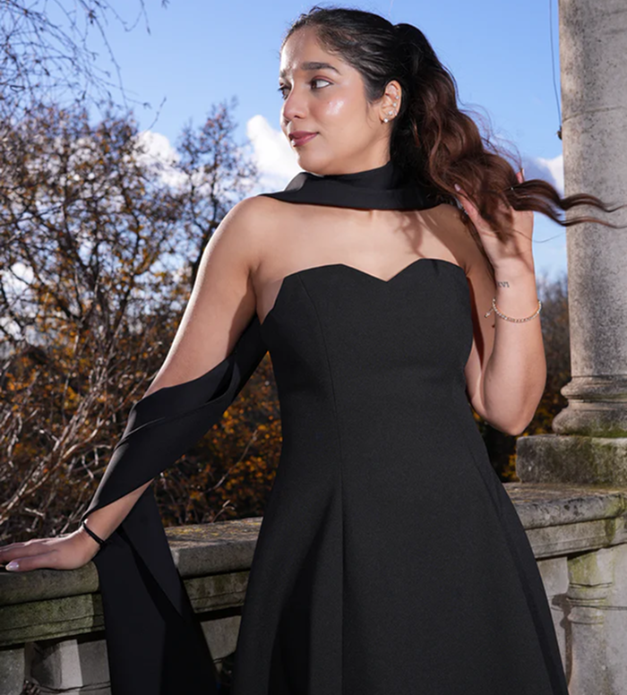 At the heart of our brand is a commitment to modern elegance and thoughtful design. We craft pieces that blend contemporary silhouettes with culturally inspired details—creating clothing that feels both timeless and distinctly personal. Our signature approach pairs refined structure with fluid artistry, much like our black midi dress featuring a sculpted sweetheart neckline and a dramatic dupatta-inspired scarf detail.